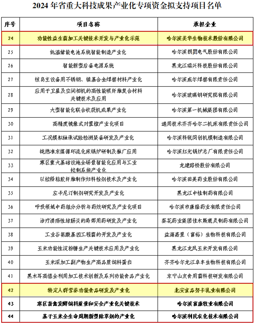 近日,黑龙江省科学技术厅发布了关于2024年黑龙江省重大科技成果产业化专项资金拟支持项目名单的公示,全省拟支持项目44个,其中,公司李柏良教授与哈尔滨美华生物技术股份有限公司联合申报的“功能性益生菌加工关键技术开发与产业化示范”,张微副研究员与北安宜品努卡乳业有限公司联合申报的“特定人群营养功能食品研发及产业化”2个项目获专项资金支持。