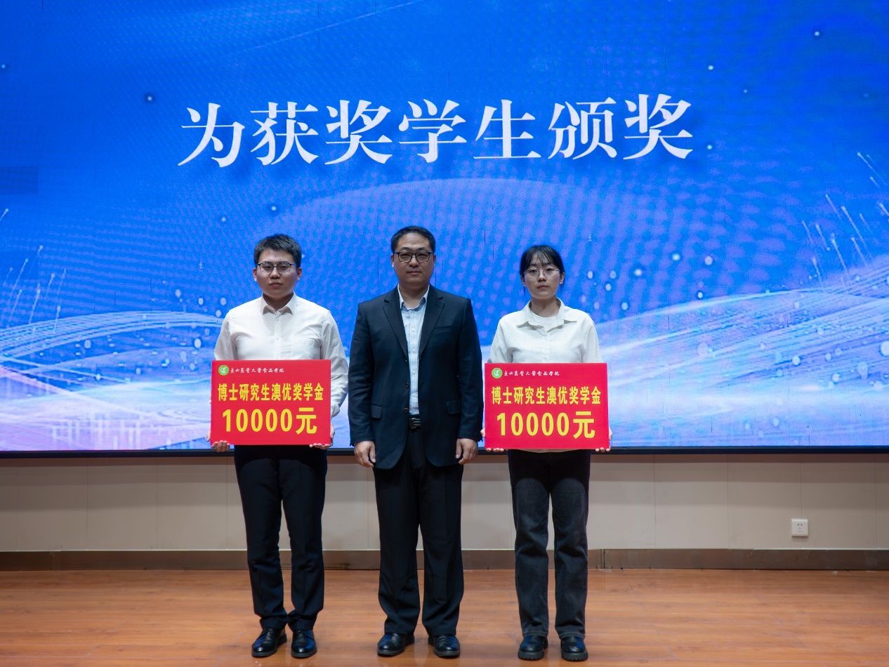 李威、施喜军、初鸿分别为博士研究生、硕士研究生和本科生获奖者颁发奖学金。