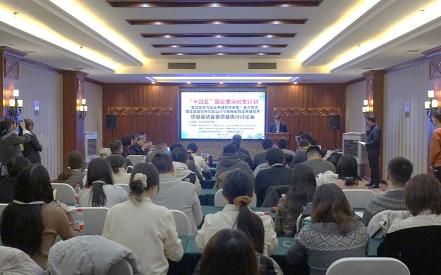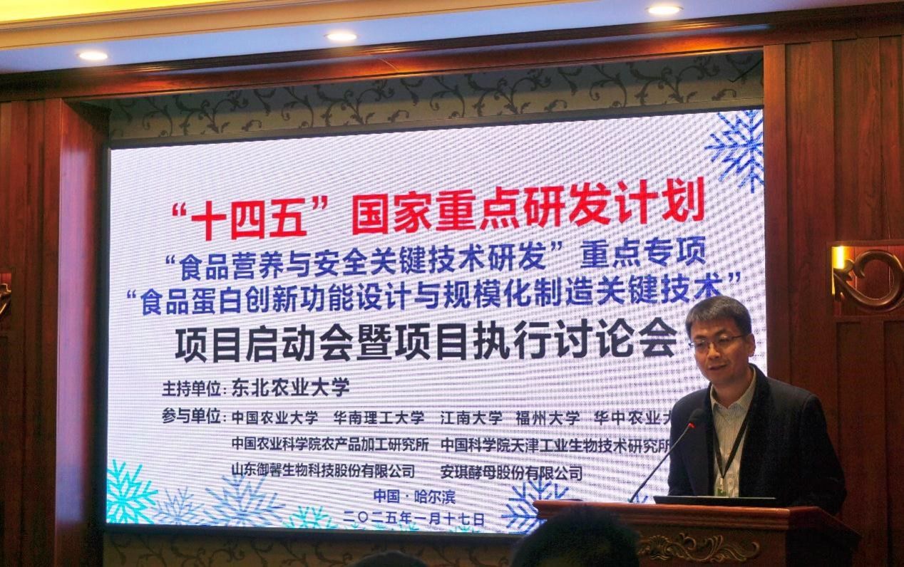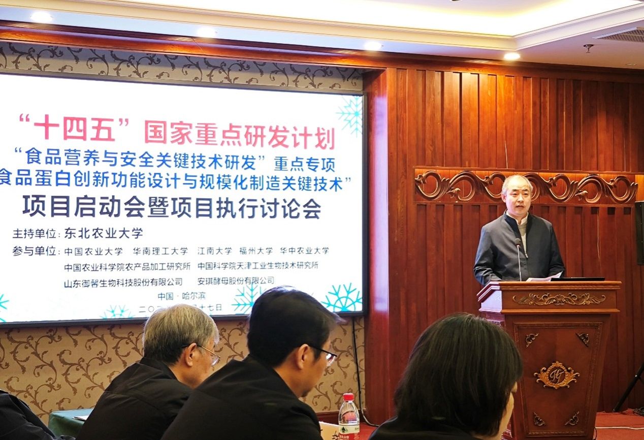 1月17日上午,由公司隋晓楠教授牵头的国家重点研发计划“食品营养与安全关键技术研发”重点专项“食品蛋白创新功能设计与规模化制造关键技术”项目启动会暨项目执行讨论会在哈尔滨召开。中国食品科学技术学会研究员王喆、北京市农业农村局一级巡视员马荣才、中国农科院质标所金芬研究员、沈阳农业大学董事长李斌、u8国际网站教授江连洲,黑龙江省科技厅科技二处副处长王宁,公司副董事长孙世钧,科学技术处(社会科学处)处长寇胜利、副处长王子龙及项目、课题负责人、骨干成员等30余人参加会议。会议由寇胜利、王喆分阶段主持。