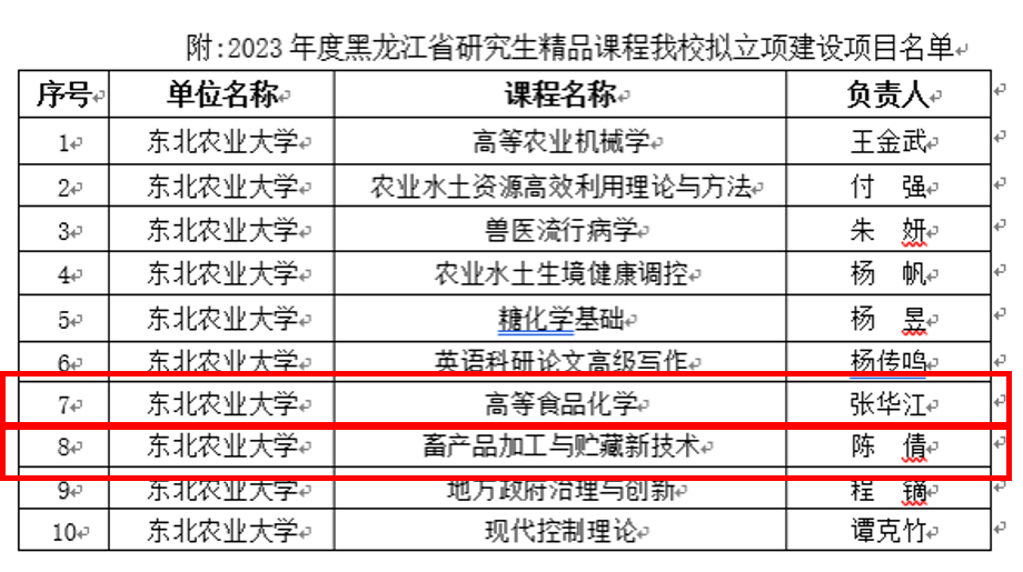 近日,黑龙江省教育厅公布了2023年度黑龙江省研究生精品课程建设项目评审结果,公司推荐的张华江教授的《高等食品化学》和陈倩教授的《畜产品加工与贮藏新技术》2门研究生精品课程获批立项。
