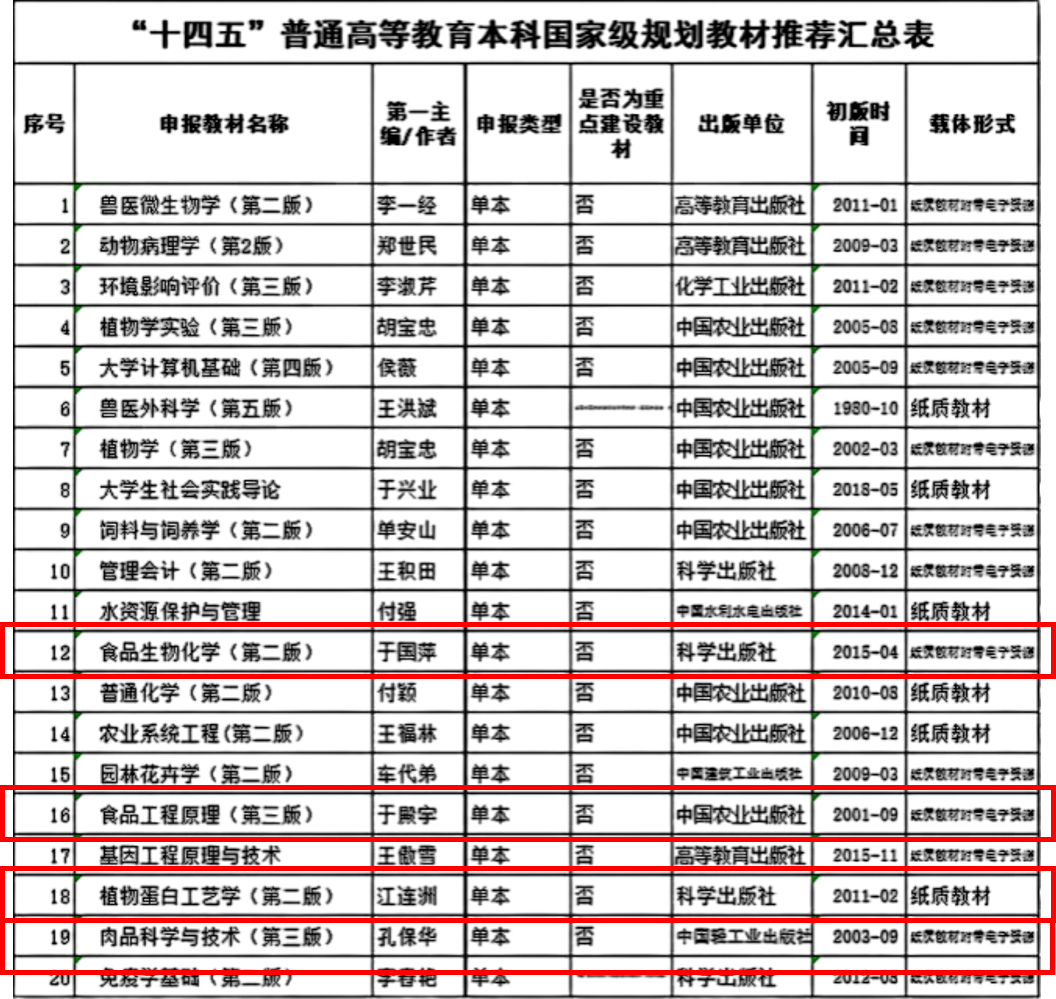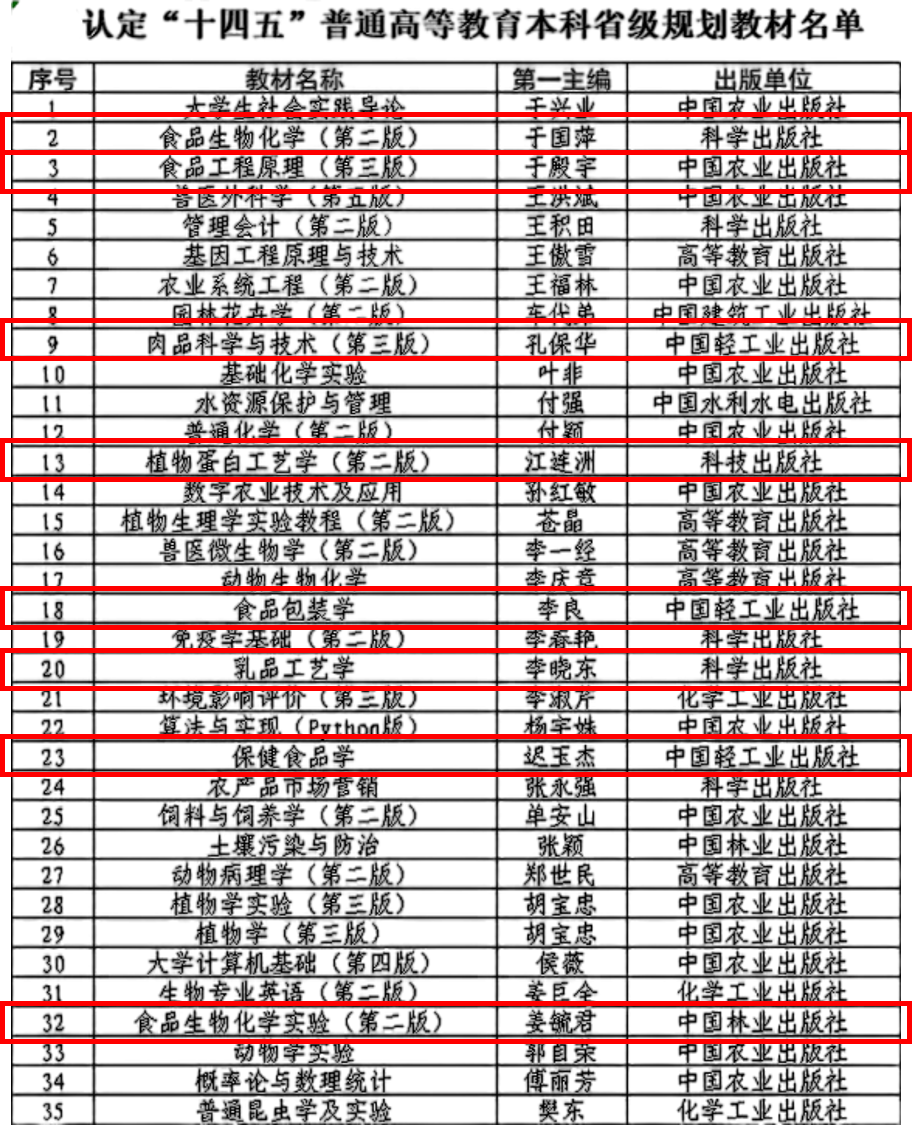 近日,黑龙江省教育厅公示了“十四五”普通高等教育本科省级规划教材和拟推荐国家级规划教材名单,公司于国萍老师的《食品生物化学(第二版)》、于殿宇老师的《食品工程原理(第三版)》、孔保华老师的《肉制品科学与技术(第三版)》、江连洲老师的《植物蛋白工艺学(第二版)》、李良老师的《食品包装学》、李晓东老师的《乳品工艺学》、迟玉杰老师的《保健食品学》、姜毓君老师的《食品生物化学实验(第二版)》8部教材成功入选“十四五”普通高等教育本科省级规划教材,其中4部教材被省教育厅推荐参加国家级规划教材评选。