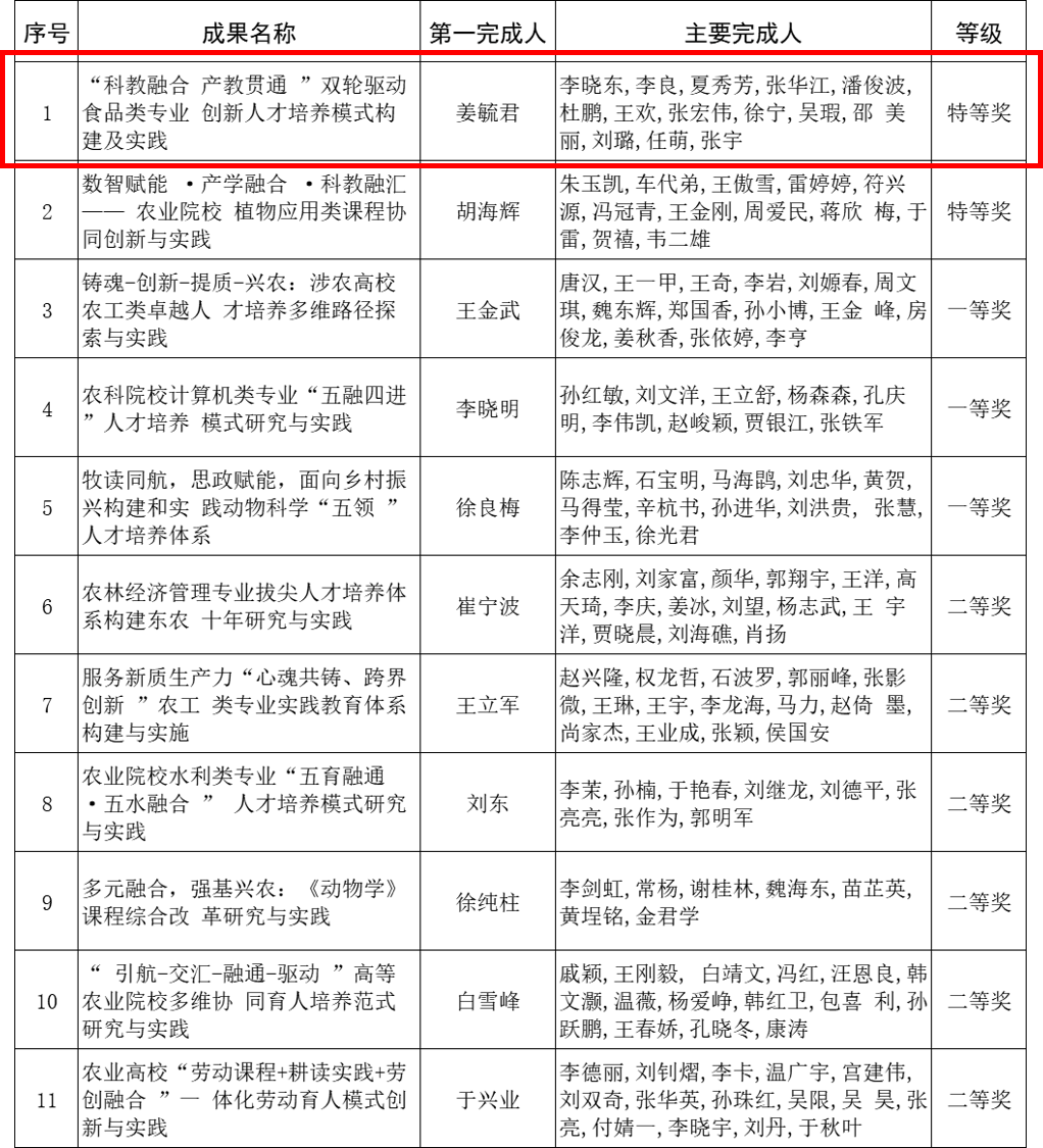 近日,黑龙江省教育厅发布《关于2024年黑龙江省高等教育(本科、研究生)和职业公司产品成果奖拟授奖成果的公示》,公司姜毓君教授为第一完成人的《“科教融合 产教贯通”双轮驱动食品类专业 创新人才培养模式构建及实践》获得特等奖,全校共有特等奖2项。