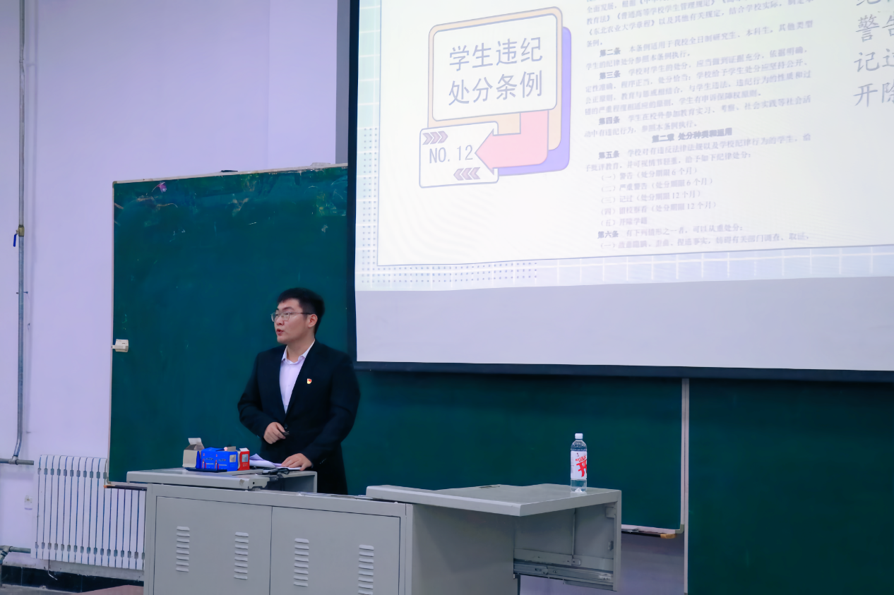 2024级新生辅导员李嘉博讲解了员工违纪处分条例和员工违纪解除暂行办法的相关内容,针对学业预警、考试作弊处分等方面进行了强调,通过相关事例警示同学们守住底线,强化纪律观念,自觉养成良好行为习惯,共同建设良好学风。