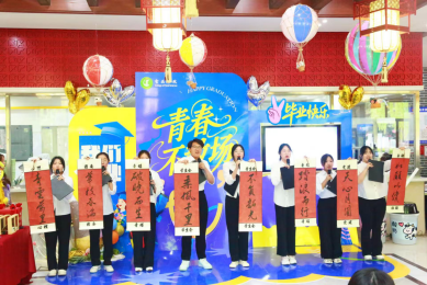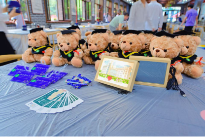 文艺演出在毕业生合唱《凤凰花开的路口》中拉开序幕,学联诗朗诵《致我们的青春岁月》倾诉不舍,辅导员活力演绎《向快乐出发》点燃全场。定制小熊、行李牌等抽奖礼物传递公司关怀。活动现场遍布“手工爱意”的巧思。奶粉罐变身憨态可掬的小蜜蜂,纸壳化作巨型“蛋糕”与“冰激凌”,充气球搭配麻绳成悬浮“热气球”,PVC水管喷涂成绚烂“烟花”,水桶变身可爱“酸奶桶”……这些师生变废为宝的设计,无声诠释着“装满行囊再出发”的期许。