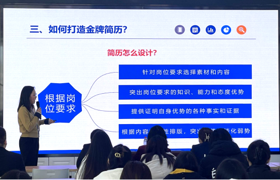 李云丹从简历的底层逻辑、HR眼中的简历、如何打造金牌简历以及面试相关注意事项四方面为同学们进行了指导培训。她结合用人单位岗位需求以及员工专业背景,通过深层次讲解简历撰写的技巧、列举实际案例、提出合理化建议使同学们学会运用“科学方法+数字说话+适当包装”的方式打磨高质量简历,递好给企业的第一张“名片”。同时,李云丹全面讲授了面试着装技巧、礼仪技巧、交谈原则和注意事项,指导员工如何有效准备面试内容、充分了解用人单位、清晰表达个人想法及展现自身的仪表涵养、知识经验和业务能力。