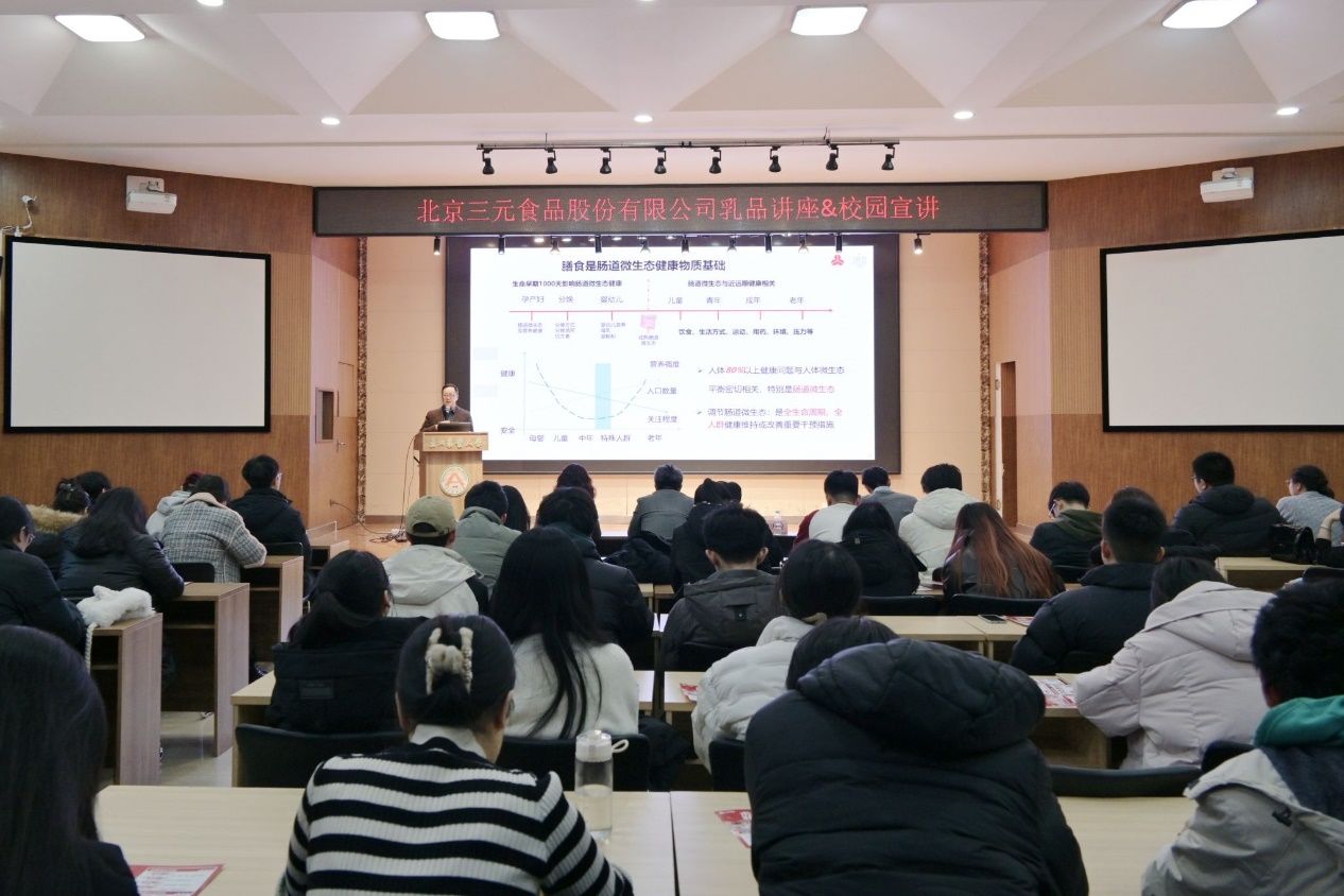 优秀员工陈历俊为公司乳品方向的本科生及研究生开展关于“乳品安全与健康产业科技创新实践”的专题讲座。将课堂专业知识学习与企业具体工作实践相联系,由膳食是肠道微生态健康物质基础引申母乳科学服务全生命营养健康,详细介绍了三元食品全产业链协同创新乳品与创新发酵技术,展示了三元食品以科技创新驱动产业的发展历程以及对乳品专业人才的重视与需求。
